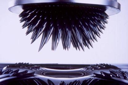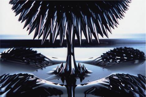 Jellyfish (medusa): Il campo magneti pu~ essere aggiustato in modo che il ferrofluido si estenda fino a toccare lÕelettromagnete superiore. La figura che si forma quando ci~ accade ¸ simile alla parte inferiore di una medusa, avente mille tentacoli e la sua dimensione pu~ essere cambiata in base al campo magnetico generato negli elettromagneti inferiori.