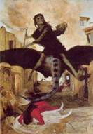 La peste è rappresentata a cavallo di un mostro e tramite il suo alito sulla gente per strada contagia e uccide.