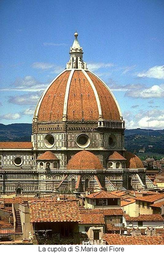 L'iniziale progetto di Arnolfo di Cambio per Santa Maria del Fiore, reso ancora più imponente dalle modifiche di Francesco Talenti, aveva lasciato la basilica con un enorme problema: chiudere il coro con una volta. La basilica di Arnolfo prevedeva certo una cupola, ma bassa, analoga a qualche calotta bizantina ancor'oggi visibile nell'Italia meridionale: possiamo vederne un'immagine virtuale nell'affresco di Cappellone degli Spagnoli in S. Maria Novella, eseguito nel 1365-67, dove il Duomo è raffigurato con una strana cupola in realtà mai esistita. Le dimensioni all'interno della cattedrale risultarono comunque alla fine così imponenti (è tuttora la terza chiesa al mondo per dimensioni dopo S. Pietro in Vaticano e Saint Paul a Londra) che non fu possibile usare il consueto metodo basato su strutture fisse che partivano da terra. I costi si sarebbero infatti rivelati proibitivi ed erano perfino state perdute, a causa della peste nera, le tecniche necessarie a un simile tentativo, trasmesse alle maestranze per via orale dai propri maestri. Del resto, voltare uno spazio di 45,5 metri di diametro senza armature su cui poggiare era veramente impensabile per gli esperti dell'epoca. Il genio del Brunelleschi si manifestò principalmente nella soluzione di questa complicatissima opera. L'ispirazione gli venne dopo un accurato sopralluogo alla cupola del Pantheon, anch'essa realizzata senza armatura e con una doppia calotta. Rientrato a Firenze, l'artista suggerì dapprima di costruire sopra il coro un tamburo poi, realizzato questo coronamento che in realtà rendeva ancora più difficile l'erezione della cupola, se ne tornò a Roma inseguito dai messaggi disperati dell'Opera del Duomo. Rientrato a Firenze suggerì di bandire un concorso per il progetto di una cupola che doveva avere questi requisiti: essere ottagonale, avere 46 metri di diametro alla base, non contenere ossatura e risultare per di più doppia. Il concorso fu bandito nel 1418 e Brunelleschi ne uscì trionfatore, ma i responsabili dell'Opera vollero affiancargli nella direzione dei lavori Lorenzo Ghiberti, che già gli aveva strappato la commessa per la Porta nord del Battistero. L'artista si offese tanto che stava per distruggere il suo modello, quando gli amici Donatello e Luca dalla Robbia gli suggerirono di darsi malato e lasciare tutta la responsabilità al Ghiberti. Così fu fatto e ben presto Ghiberti gettò la spugna dichiarandosi assolutamente incapace di capire il progetto e portare avanti i lavori. Riconosciuto nel 1423 «inventore e governatore della cupola maggiore», Brunelleschi condusse l'opera con rivoluzionari sistemi costruttivi, che stupirono i contemporanei; adottando la muratura in mattoni a 'spinapesce' (studiata sui monumenti romani), eliminò centine e armature e portò avanti progressivamente la struttura, capace di autosostenersi, scaricando i pesi e le spinte per mezzo di una doppia calotta a sesto acuto, differenziando e armonizzando in tal modo il volume della cupola rispetto all'interno e all'esterno. Il compimento dei lavori della grande opera si protrasse a lungo: nel 1434 la cupola era compiuta, «erta sopra e cieli, ampla da coprire con sua ombra tucti e popoli toscani» (Alberti); del 1432 è il progetto (messo in atto nel 1436) della lanterna, elegantissima architettura in dimensioni ridotte, necessario punto di convergenza delle linee di forza dei costoloni. Nel 1438 B. realizzò, negli intervalli dei corpi sporgenti dell'ottagono absidale, quattro piccole tribune, come elemento di raccordo delle masse plastiche da cui scatta lo slancio della cupola, alleggerite da profonde nicchie di ispirazione classica.
