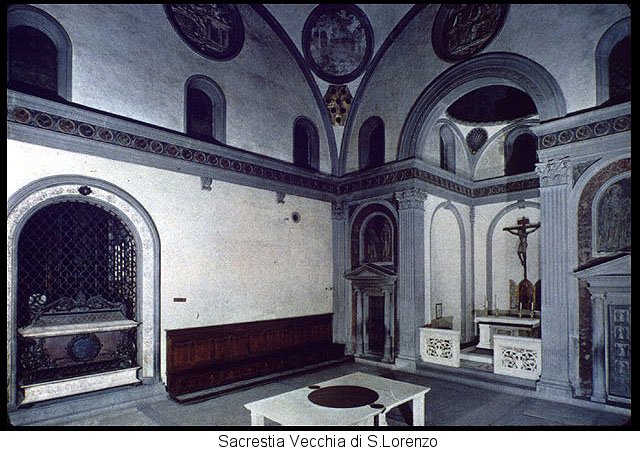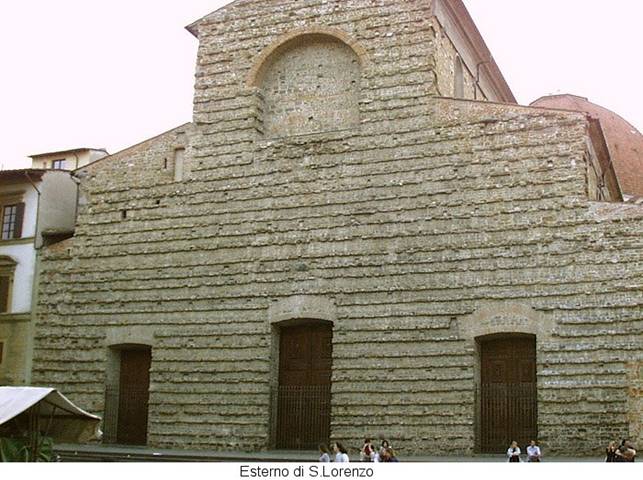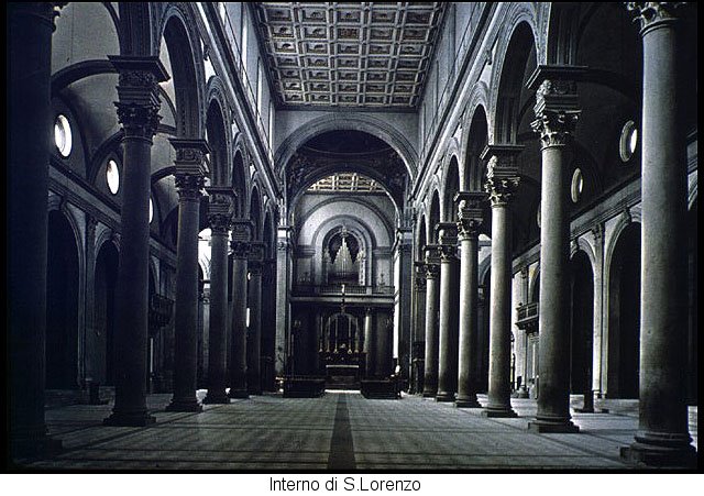 Nel 1418 Brunelleschi stese un piano per la ricostruzione della chiesa agostiniana di S. Lorenzo, che era la chiesa parrocchiale dei Medici; di conseguenza la sua storia è sempre stata molto legata alle sorti della potente famiglia. Quando i lavori erano già a buon punto, una serie di rovesci finanziari costrinse all'esilio Cosimo de' Medici, e ciò comportò l'improvvisa chiusura del cantiere, che non riaprì fino al 1442, quattro anni prima della morte di Brunelleschi. Di conseguenza l'esterno della chiesa non fu portato a termine e rimase d'impronta nettamente romanica. Ora la facciata riflette la semplicità dell'interno brunelleschiano. Questo presenta una netta preferenza per il muro pieno, sebbene abbia finestre sulle facciate laterali e una serie di alti pilastri corinzi che sorreggono archi a tutto tondo; viene applicato il modello delle prime basiliche della cristianità, con te navate e il tetto piatto, segno di semplice austerità. Brunelleschi introduce all'interno di questo sistema un modulo matematico, che ben si confaceva al suo spirito razionalista e minimalista: usa la campata quadrata per costituire uno spazio armonico e ripetitivo che domina sia la navata, che consta di quattro moduli, che il transetto. Lo spazio è scandito dalle cappelle laterali e da una sapiente distribuzione della luce. Accanto al tema basilicale che domina la chiesa, Brunelleschi recupera in questo complesso architettonico anche un'altra forma della tradizione, cioè la pianta centrale, che viene applicata nella Sacrestia Vecchia. Formata dal coordinamento di due puri elementi geometrici, è un vano cubico (in cui si apre una piccola cappella pure a pianta quadrata) sormontato da una cupola emisferica a vele, raccordata alle pareti da pennacchi. Ogni parete è definita da quattro colonne corinzie su cui poggia una trabeazione che corre lungo le pareti. L'essenziale decorazione è rigorosamente a due toni: i muri sono dipinti in bianco, mentre la grigia pietra serena sottolinea le principale linee di forza. Per concludere, nel complesso di S. Lorenzo Brunelleschi proponeva il suo nuovo tipo di chiesa, accentuatamente classicheggiante, irrorata dalla luce per una netta evidenza architettonica (e non misticamente penombrata come in precedenza), assolutamente regolare e simmetrica. E' una chiesa in cui si avverte una componente razionale e laica, una scansione misurata, che predominano sul precedente senso corale, religioso, collettivistico.