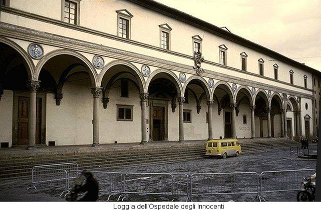 L'ospedale degli Innocenti è la prima istituzione di questo genere in Europa (1419). Ideato per curare e allevare i bambini orfani o abbandonati e dar loro un mestiere, lo 'Spedale' fu edificato al tempo della Repubblica fiorentina per volontà dell'Arte della Lana, che lo finanziò interamente, e affidato a Brunelleschi, che qui realizzò un esempio armonico e razionale di architettura ospedaliera nell'insieme di chiostri, portici, refettori, dormitori, infermerie e 'nursery'. In questo edificio Brunelleschi mirò prevalentemente alla funzionalità, e si valse così di uno dei primi esempi di architettura modulare, che tuttavia nell'estetica rinascimentale non poteva che risultare piacevole, data la costante ricerca, da parte dell'arte di questo periodo, di equilibrio e di armonia geometrica. Il chiostro vede infatti una precisa equivalenza fra la corda dell'arco, l'altezza delle colonne e la profondità del portico, un'uguaglianza fra le tre dimensioni che crea per ogni campata un modulo spaziale cubico, geometricamente perfetto, la cui ritmica successione genera una cristallina purezza d'insieme.