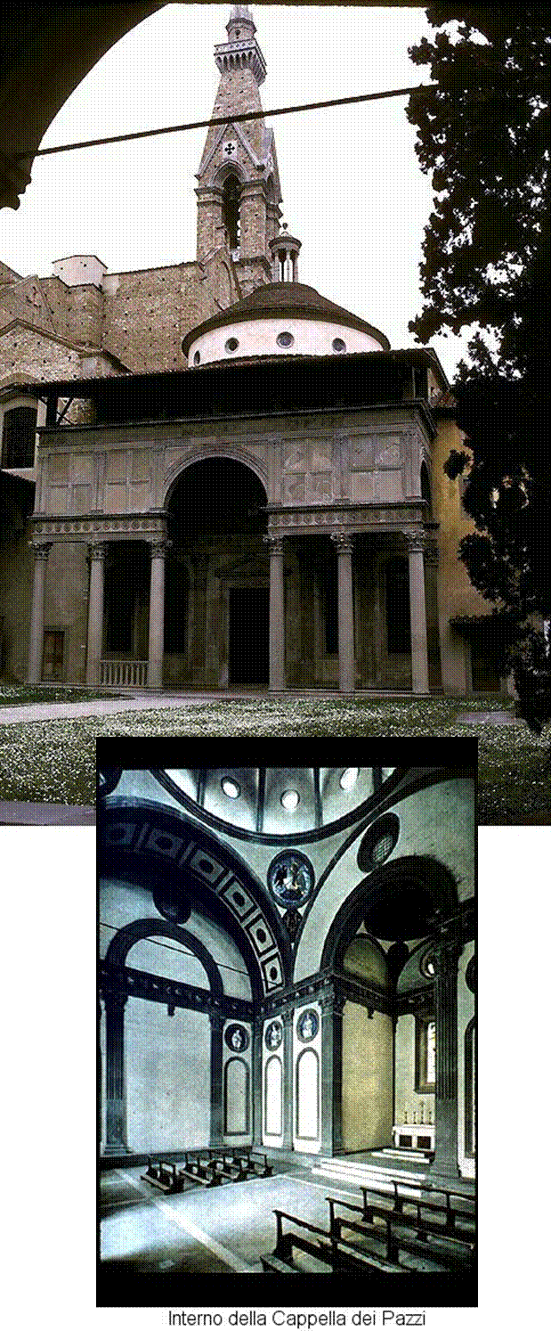 La Cappella dei Pazzi fu progettata per essere una sala capitolare del monastero di S. Croce, ma servì anche da sala assembleare privata per la famiglia committente. E' in sostanza una versione più complessa della Sacrestia Vecchia di S. Lorenzo. Qui Brunelleschi arricchisce lo schema elementare della sua precedente opera con una pianta rettangolare, che affianca al vano centrale coperto a cupola due brevi bracci laterali con copertura a botte, con effetto di dilatazione dello spazio. La perfetta armonia spaziale dell'interno deriva dall'applicazione del rapporto di 'sezione aurea' e dalla rigorosa integrazione di architettura e partizioni decorative (tanto rigorosa da far supporre, quasi con certezza, l'intervento diretto di B. nei tondi con figure policrome degli Evangelisti nei pennacchi della cupola); come in S. Lorenzo, la decorazione tende ad una raffinata essenzialità. Quanto all'esterno, Brunelleschi morì prima di poter completare la facciata, che tuttavia fu finita ispirandosi al suo progetto. La caratteristica principale dell'attuale facciata della cappella è il portico a colonne corinzie con un arco a tutto tondo centrale. Quest'arco incornicia l'entrata e sposta l'attenzione del visitatore sulla cupola soprastante. Il muro della facciata vera e propria vede un pilastro per ogni colonna del portico, il quale consta di una piccola cupola fiancheggiata da due volte a botte.