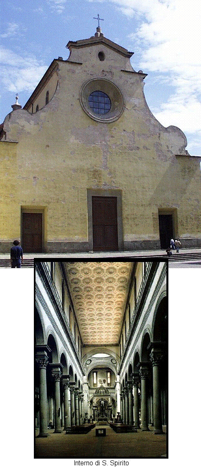 S. Spirito è una versione perfezionata e ampliata di S. Lorenzo in cui le idee direttrici dell'ispirazione brunelleschiana, ossia armonia, modularità ed essenzialità, trovano lo loro più completa enunciazione, almeno in fase di progetto; come già detto, infatti, Brunelleschi morì molto prima che l'edificio fosse compiuto, tanto che questo fu più volte modificato prima del termine dei lavori, nel 1482. Brunelleschi diviene qui più preciso e plastico. La navata centrale misura in larghezza esattamente il doppio di una navata laterale e in altezza viene a porsi sullo stesso piano delle laterali medesime. Tutte le misure planimetriche si deducono da una sola: il lato della campata minore; l'articolazione degli spazi è affidata a colonne tutte uguali: domina quindi il più stretto rigore geometrico e modulare. Nicchie semicircolari rimpiazzano le cappelle quadrate di S. Lorenzo, dando l'impressione che il muro portante sia scavato. Attraverso questa continua serie di concavità viene negata la possibilità di valutare lo spessore del muro esterno, in modo che la materia non si imponga come consistenza materiale (spessore ecc.) ma come mezzo per scandire spazi. Inoltre, secondo il progetto originale, le nicchie dovevano essere visibili all'esterno, annullando la tradizionale dicotomia dentro-fuori degli spazi architettonici.