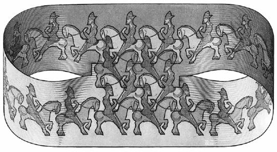 La tecnica di un ciclo, di un anello chiuso, o il suggerimento di una processione ripetuta di figure che tornano su se stesse, sono stati tutti i mezzi che Escher utilizzò per cercare di creare un piano illimitato all'interno del quale posizionare dei personaggi.