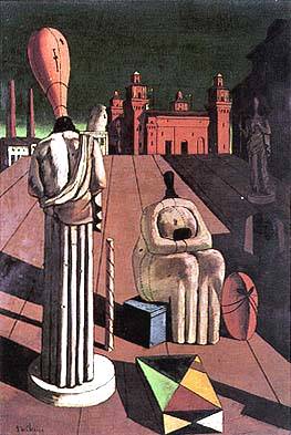 Le sue immagini mostrano una realtà che solo apparentemente assomiglia a quella che noi conosciamo dalla nostra esperienza. Uno sguardo più attento ci mostra che la luce è irreale e colora gli oggetti e il cielo di tinte innaturali. La prospettiva, che sembrava costruire uno spazio geometricamente plausibile, è invece quasi sempre volutamente deformata, così che lo spazio acquista un aspetto inedito. Le rappresentazioni di De Chirico superano la realtà, andando in qualche modo «oltre», ci mostrano una nuova dimensione del reale (da ciò il termine «metafisica» usata per definirla).