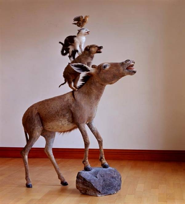 Tra la fine degli anni sessanta - in un periodo dominato dal concettuale che investiga sull'idea stessa di arte - la pittura, come un fiume carsico, scompare alla vista dei più, tanto che ci s'interroga addirittura sul perché della sua esistenza, e dopo un certo periodo e tragitto nel quale scorre sottoterra, lontano dalle luci dei riflettori, a un certo punto riaffiora alla fine degli anni settanta. Questa riscossa della pittura in Italia ha preso il nome di transavanguardia. La transavanguardia rompe con il "darwinismo linguistico" e quindi, con un'idea evoluzionistica dell'arte che caratterizzò l'esperienza delle avanguardie storiche dai primi anni del Novecento fino alla metà degli anni settanta, in base alla quale ogni avanguardia doveva negare e superare quella immediatamente precedente, con il risultato di un accumulo impressionante d'informazioni visive e il conseguente disagio del pubblico. La transavanguardia si pone da subito come un rallentamento, per cui le creazioni artistiche assumono da subito un "respiro biologico" che permette loro di venir assimilate, rispetto a questa corsa all'impazzata. Con la transavanguardia si ritorna quindi al quadro o, meglio, questo vien guardato di nuovo con vivo interesse; alla pittura di narrazione, anche se trattata con grande ironia. Caratteristica della transavanguardia, in un periodo di crisi e di progressiva decadenza delle ideologie, è il bisogno di confrontarsi con i grandi temi della pittura, attraverso la composizione d'immagini e la narrazione di storie. Gli animali compaiono nell'opera dei pittori in modo infantile, giocoso e immediato, spesso come immagini buttate lì quasi per caso, eppure con un effetto molto potente. Contemporaneamente allo sviluppo della transavanguardia in Italia, oltreoceano opera l'artista multimediale Sandy Skoglund (1946). La Skoglund ha studiato pittura e storia dell'arte allo Smith College di Northampton nel Massachussets dal 1946 al 1968. dopo la laurea all'università dello Iowa nel 1969 si concentrò sulla produzione cinematografica, la produzione di stampe d'incisione e l'arte multimediale. Nel luglio del 1972 inizia a lavorare come artista concettuale specializzandosi nella produzione artistica ripetitiva finalizzata al procedimento fotomeccanico. Sandy realizza delle installazioni che poi fotografa ricreando delle stanze, dove recitano degli attori in carne ed ossa e un numero esagerato di animali per creare scene oniriche. Nella sua opera, infatti, gli animali sono presenti sempre all'interno di questi ambienti sognati. La Skoglund, intervistata a questo proposito, dichiara: "Popolo i miei soggetti di animali, scolpiti in creta e poi modellati in resina, quindi fotografo il tutto. Gli animali possono rappresentare per noi che viviamo nel presente la possibilità di viaggiare nel tempo, in quanto la relazione tra uomo e animale è cambiata nel corso della storia. L'animale assume così nella realtà il ruolo di una sorta di coscienza alternativa.Credo che esista un contrasto tra l'aspetto della fantasia - gli animali sono visti come cartoon o fantasie - e la realtà. Poiché noi, in quanto esseri umani, ci consideriamo la principale forma di coscienza esistente in natura, ho scelto di popolare le mie immagini con animali per introdurre nella nostra esperienza questa coscienza alternativa"[1]. Le sue opere hanno spesso queste presenze di "coscienza alternativa". Si va da Radioactive Cats del 1980, con inquietanti gatti verdi che si aggirano all'interno di una stanza poco ammobiliata e dall'aspetto desolato, al capolavoro del 1981 Revenge of the Goldfish, probabilmente la sua opera più riuscita. In quest'opera i pesci rossi nuotano nell'aria all'interno di una camera da letto, con un bimbo che si è appena svegliato seduto sul letto e l'altro che dorme ancora, in un'atmosfera onirica. Galleggiare e volare sono sensazioni frequenti nei sogni e, in questo caso, i pesci rossi incarnano perfettamente l'idea. Ma oltre a Revenge of the Goldfish, ci sono altre numerose fotografie a colori Cibachrome che documentano la passione di Skoglund per gli animali, come Fox Games del 1989, in cui una miriade di volpi si aggirano sopra e sotto i tavoli di un ristorante; o come Cats in Paris del 1993, con una serie di gatti che si aggirano sui tetti della capitale francese.