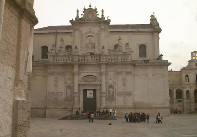 La Cattedrale fu costruita in onore del patrono S.Oronzo e completamente rifatta da Giuseppe Zimbalo, il maggiore esponente dell'architettura barocca salentina. Questi risolse il problema per cui chi entrava sul sagrato aveva di fronte non la facciata della Cattedrale, orientata verso il Seminario, quindi a destra, bensì la parete laterale della Chiesa: addossò alla lunga parete esterna sinistra una facciata e la promosse a entrata principale in questo modo immediatamente visibile e di maggior effetto per chi entrava sul sagrato. Questo prospetto è quindi più esuberante e maestoso: il portone è rinserrato da due robuste colonne scanalate i cui capitelli sono ornati da figure leonine. Ai lati di queste due colonne si trovano due nicchie dall'elaborata cornice, in cui sono alloggiate due statue di santi. La ricchissima trabeazione finemente decorata è sormontata da una alta balaustra alternata di colonne e piastrini, oltre la quale, entro un arco di trionfo, è situata un'imponente statua di S.Oronzo. Ai suoi lati, ancora due statue di santi fra pinnacoli, fiori, frutti e stemmi.