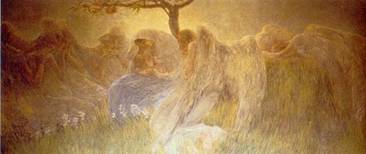 Spazio, luce e colore: Previati utilizza la tecnica filamentosa, quasi pettinata delle pennellate che, sovrapponendosi al disegno, costruiscono le figure con un andamento striato e leggermente curvo. L'immagine è bidimensionale, priva di volume e di ogni costruzione prospettica. È inoltre caratterizzata da una gamma cromatica semplificata di colori puri. La luce chiarissima proveniente dal fondo dà un effetto di diffusa luminosità, che assume un valore mistico-simbolico, teso a coinvolgere sentimentalmente lo spettatore.