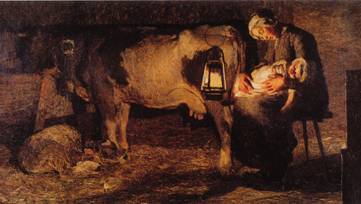 Soggetto: una contadina, stanca dalle fatiche della giornata, è seduta nella stalla con in braccio il suo bambino, accanto a lei una mucca con il suo vitellino. Le due madri sono accomunate dalla durezza del lavoro della vita contadina, simboleggiano un universale sentimento di amore materno che pervade tutta la natura.