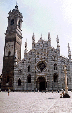Secondo le cronache di Paolo Diacono, l'attuale costruzione sorse sul luogo dove, alla fine del sec. VI, Teodolinda dedicò un oratorio a S. Giovanni Battista e di cui sono rimaste labili tracce (parte di una torre è ora inclusa nel perimetro absidale). La prima fase dei lavori (sec. XIII) comportò l'erezione del corpo orientale della chiesa, composto dall'abside maggiore, dal transetto e da una prima sezione del piedicroce, lo sviluppo del quale si ebbe invece nei primi decenni del Trecento. Insieme alle due cappelle maggiori, a fianco dell'abside, si aggiunsero, dopo la metà del sec. XIV, quelle minori e laterali alle navate. E' tuttavia sul finire del secolo, sotto la direzione di Matteo da Campione, che la fabbrica si arricchisce delle parti più significative: la facciata, l'evangelicatorio e il battistero, oggi però scomparso. I rimaneggiamenti interni del '600 e '700 condussero poi all'occultamento degli elementi del corpo di fabbrica duecentesco, nonché alla sostituzione degli esistenti cicli pittorici, salvo quello degli Zavattari nella cappella di Teodolinda, con altre opere che diedero spazio a una sorta di antologia della pittura settecentesca milanese. Il più rilevante intervento di restauro fu operato da Luca Beltrami (1889-1908) con il rifacimento della facciata e il criticato completamento delle cuspidi terminali, già rimosse nel sec. XVIII, sul modello dell'unica rimasta collocata sul saliente meridionale.