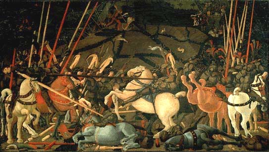 Originariamente i tre pannelli erano collocati in una sala terrena di Palazzo Medici, detta "camera di Lorenzo". Essi rappresentano tre momenti diversi dello scontro avvenuto a San Romano nel 1432.