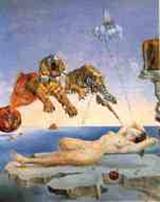del 1944, l'atmosfera è incredibilmente tersa, come in un mattino di primavera dopo una pioggia che ha pulito l'aria. Lo spunto è banale: durante il sonno il volo di un'ape aveva disturbato Dalì e, riaddormentatosi, gli aveva provocato una visione che ha ispirato questo quadro. Il sogno riutilizza elementi reali, presenti nella stanza dove Dalì stava dormendo: il melograno e il pesce. In basso, bellissima nella sua sensuale nudità, Gala (la compagna dell'artista) riposa, sollevata magicamente a mezz'aria, sopra un piatto scoglio frastagliato. Gala è moglie, ispiratrice ed amante ma è, soprattutto, l'ingrediente erotico più importante e ricorrente nei sogni di Dalì. Una baionetta appuntita sta per trafiggere il braccio destro della donna: siamo nell'istante che precede la sensazione del dolore. La puntura, comunque, c'è già stata, e la sua percezione assume la forma mostruosa di due tigri feroci che balzano fuori dalle fauci di un pesce a sua volta scaturito da una rossa melagrana spaccata. Sullo sfondo un assurdo elefante dalle scheletriche zampe d'insetto regge un obelisco sulla groppa. Nonostante ciò, riesce a camminare sull'acqua con leggerezza di libellula, senza neanche increspare la piattezza d'un impossibile mare senza onde. L'elefante è quello del Bernini di Piazza della Minerva, a Roma. Al gusto quasi fumettistico che l'artista pone nel rappresentare le tigri e il pesce si contrappone la perfezione d'un nudo più eroticamente realistico che astrattamento accademico. In questo come in quasi tutti i dipinti del maestro non è possibile riscontrare alcuna unitarietà. Ciò dipende dalla natura stessa dell'ispirazione, che, attingendo dalle dimensioni del sogno o della paranoia, è necessariamente frammentaria, visionaria e incoerente.