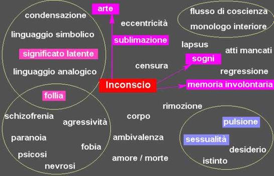 Il grafico evidenzia quattro aree di analisi nella vastissima panoramica di ambiti e prospettive che abbraccia la tematica dell'inconscio. - In basso a sinistra la parola chiave follia richiama le degenerazioni, purtroppo stabili, della razionalità, che subisce la forza devastante dell'inconscio, perenne produttore di realtà sostitutive, provocando il pericoloso allontanamento dai rapporti comunicativi.