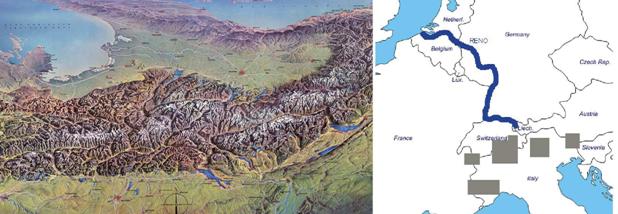 Fig.1 - A destra rappresentazione geografica dell'arco alpino visto da nord; a sinistra il corso del fiume