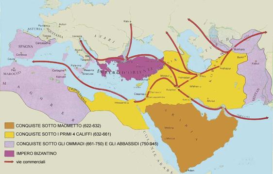 Fig.4 - Direttrici dell'espansione araba e rotte commerciali.