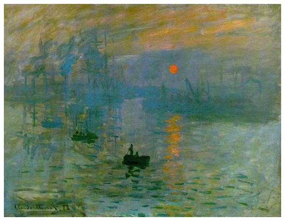 In "Impressione, sole nascente", una delle opere più significative di Monet, le immagini sono decomposte in una molteplicità di tratti di colore, stesi a rapide pennellate; le figure sono prive di contorni e di rifiniture. Sembra un abbozzo sommario e approssimativo ma provando ad allontanarsi dall'immagine, le macchie prendono forma, si riconoscono mentre l'insieme dell'immagine provoca impressioni profonde. Si percepiscono, come cose vive, animate e pulsanti, l'atmosfera e la luce nell'aria e nell'acqua. Gli impressionisti hanno capito che all'occhio umano basta dare i suggerimenti giusti perche egli ricostruisca, sulla base della propria conoscenza della realtà, le forme.