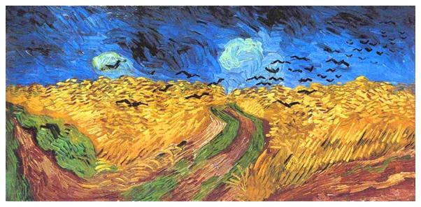 È il caso dell'opera "campo di grano con volo di corvi" in cui l'artista afferma: "Ci sono campi di grano che si estendono all'infinito sotto un cielo cupo e non ho paventato il tentativo di rappresentare tristezza ed estrema solitudine . Sono quasi convinto che queste immagini vi parlano di cose che non posso esprimere in parole, e cioè della salute e della vitalità che io scopro nella vita di campagna'. Le parole dell'artista sono evocative dell'amore per la natura, dello stato d'animo provato di fronte al paesaggio agreste.