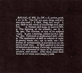 L'Arte dunque diventa qualcosa di astratto, che trova la sua più efficace - ma non completa - definizione nella fredda definizione di un vocabolario. Alle parole viene affidato l'impegnativo compito di esprimere ciò che la rappresentazione artistica non riesce a raffigurare, poiché esse si fondano su concetti accettati convenzionalmente: solo le parole riescono ad esprimere idee perché solo le parole - e non le ingenue rappresentazioni artistiche - sono funzioni che collegano l'aspetto semiotico con quello ideale di un concetto.