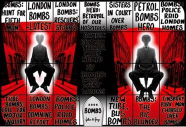 La parte dell'opera presa in esame si costruisce sui titoli di strilli - ovvero i poster che reclamizzano l'edizione del giorno - dei vari quotidiani inglesi che presentano, tutti, queste parole nei titoli che comunicavano gli avvenuti attentati alla metropolitana di Londra; queste brevi frasi ad effetto circondano le figure dei due artisti che, tramite vari collage grafici, si presentano all'osservatore deformati e sdoppiati, circondati da un'aura che sembra separarli dalla realtà di morte che li circonda.