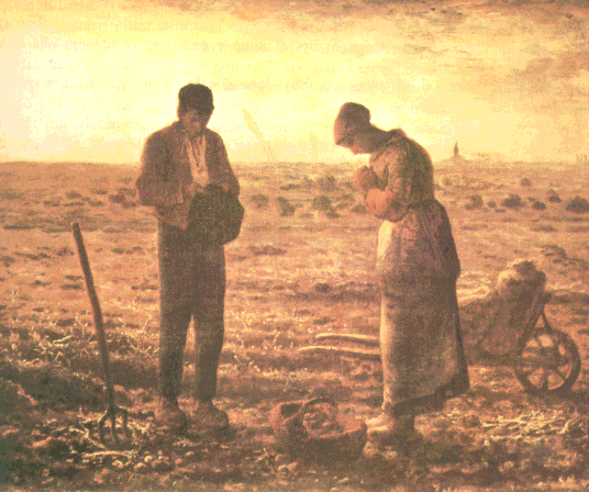 'L'Angelus' è un dipinto di cm 55 x 66 realizzato da Millet tra il 1857 ed il 1859; è conservato al Musée d'Orsay di Parigi. Questo dipinto raffigura un agricoltore e la moglie al tramonto con le teste chine mentre una campana suona l'Angelus serale (l'Angelus è una preghiera latina recitata tre volte al giorno: il nome deriva dalle sue parole iniziali, Angelus Domini, Angelo di Dio). L'uomo appare rigido ed imponente come una colonna, ma denuncia la sua fragile personalità reggendo goffamente tra le mani il cappello. La donna è vista in netto profilo. La testa forma una sagoma che risalta contro lo sfondo più chiaro del cielo. Sullo sfondo, il campanile da cui risuona l'Angelus interrompe bruscamente l'orizzonte. Coerente all'interesse mostrato da Millet per la vita rurale, quest' opera ci mostra uno spaccato del ruolo giocato dalla religione nella vita dei contadini secondo l' autore: la scelta di usare un solo colore in varie tonalità si riallaccia infatti, insieme alla grande importanza data alla luce, al desiderio dell'autore di comunicare il senso del divino della scena.