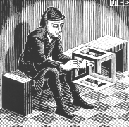 Il cubo di Necker è disegnato nel progetto che sta ai piedi del personaggio seduto sulla panca (con i due punti problematici evidenziati), ed egli tiene in mano un modello di 'cubo impossibile', in cui l'ambiguità viene risolta fondendo le due possibilità, e creando così un cubo localmente corretto (nella parte alta e in quella bassa), ma globalmente impossibile. L'edificio della figura realizza poi il cubo impossibile, congiungendo paradossalmente le parti alta e bassa, che sono separatamente consistenti.