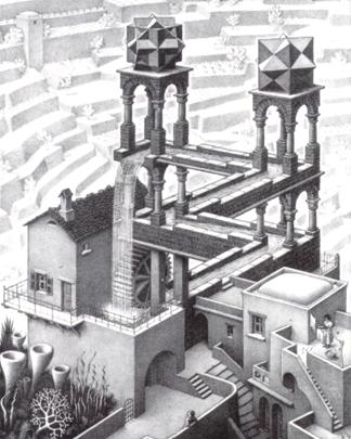 Escher crea così l'impressione doppiamente paradossale, da un punto di vista fisico, di un moto perpetuo generato dall'acqua che scorre all'insù. Si noti come l'intera figura sia in realtà la sovrapposizione di due figure separatamente consistenti: due torri (l'una a tre piani e l'altra a due), e un canale orizzontale (con i lati a due a due perpendicolari).