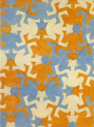 ".Durante l'inverno 1937-1937 Escher si occupò quasi esclusivamente di divisione regolare. Lavorava simultaneamente ma separatamente su tre fronti: ricerca matematica, creazione di divisioni regolari con figure riconoscibili e composizione di opere grafiche con divisioni regolari. [.] Stando alla teoria escheriana, in una divisione regolare del piano la riconoscibilità delle singole figure è un requisito inderogabile, da ottenere contrastando i colori delle figure adiacenti. Tale contrasto era parte integrante in tutte le ricerche di Escher, e per raggiungere il suo scopo egli intendeva usare un numero minimo di colori. Senza saperlo, s'inoltrò da pioniere in un campo che, più di vent'anni dopo, gli scienziati avrebbero definito "simmetria di colore". Escher aveva notato che alcuni motivi di divisione regolare del piano richiedessero almeno tre colori.". (estratto pag 36-39 di "Visioni della Simmetria" di D.Schattschneider).