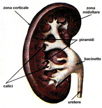 I glomeruli dei vari nefroni, costituiti da un ammasso di capillari, formano la parte più esterna del rene detta corticale, i tubuli nel loro insieme costituiscono la parte midollare suddivisa in sezioni costituenti le piramidi del Malpighi
