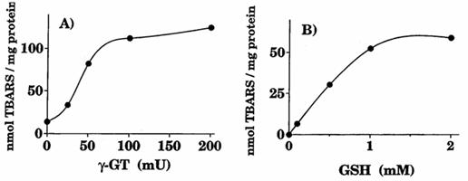 Incubazioni (1ml di volume finale) contenti LDL (0.1 mg prot/ml), Gly-Gly (20 mM) e ADP-Fe(III) (150 µM ADP-15 µM FeCl3) in PBS pH 7.4, 37°C. A)Le reazioni sono state iniziate mediante l'aggiunta di GSH (2mM), in più aumentando le concentrazioni di GGT. (B) GGT era mantenuta costante (50 mU/ml) e le reazioni sono state iniziate aggiungendo concentrazioni crescent di GSH. (Paolicchi et al., 1999)