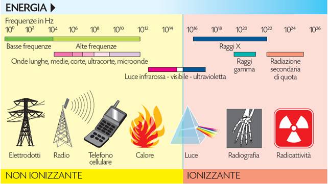 L'effetto biologico delle onde elettromagnetiche dipende essenzialmente dalla loro intensità e dalla loro frequenza. Di conseguenza lo spettro elettromagnetico può essere suddiviso in due tipologie principali: le radiazioni ionizzanti (per esempio i raggi X e gamma) e quelle non ionizzanti, come le onde radio e le microonde . La linea di demarcazione tra i due tipi di radiazione si colloca all'interno delle frequenze dell'ultravioletto, sicché le radiazioni infrarosse e parte dell'ultravioletto rientrano nelle radiazioni non ionizzanti, mentre la componente superiore della radiazione ultravioletta fa già parte di quelle ionizzanti. Fra i due tipi di radiazione c'è una differenza fondamentale. Le radiazioni si differenziano fra loro per la diversa capacità che hanno di interagire con gli atomi e le molecole che compongono la materia. La forza delle radiazioni potrebbe essere