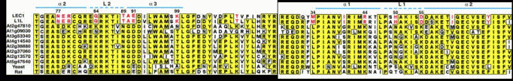 Fig. . Allineamento delle sequenze aminioacidiche del dominio B delle subunità HAP3 di Arabidopsis, lievito, ratto. In giallo sono mostrati i residui identici. In rosso sono evidenziati i residui aminoacidi specifici di LEC1 e L1L. Le linee continue e tratteggiate in azzurro indicano rispettivamente le posizioni delle a eliche e le anse nel motivo di ripiegamento istonico. I numeri indicano le posizioni degli