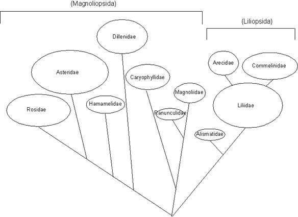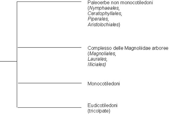 - un gruppo molto più piccolo che include le famiglie che hanno mantenuto caratteri più primitivi. Questo gruppo, che corrisponde grosso modo alla sottoclasse Magnoliidae della classificazione di Cronquist, può essere ulteriormente suddiviso in due: