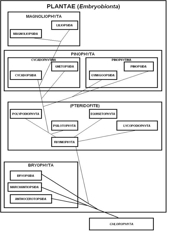 Fig. 3 - Il regno vegetale (Embryobionta). Le linee indicano i possibili legami filogenetici tra le piante.
