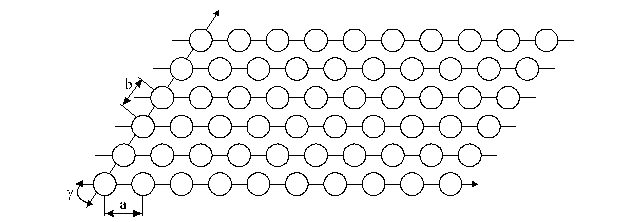 Supponiamo ora che lo stesso motivo venga ripetuto periodicamente in due direzioni diverse, formanti un angolo g fra loro, con successivi spostamenti di lunghezza a e b, rispettivamente. La disposizione risultante dei motivi così ripetuti è riportata nella figura seguente. Essa costituisce un reticolo piano: parametri di tale reticolo sono le due distanze elementari a e b, detti periodi d'identità, e l'angolo g tra queste ultime.