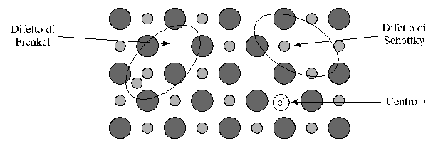 Centro F (da Farbe che in tedesco significa "colore"): Una semplice lacuna anionica in un cristallo ionico genera un eccesso locale di carica positiva. Un elettrone può migrare a questo sito e venire legato, prendendo, in effetti, il posto dello ione negativo assente. La presenza di un certo numero di tali difetti conferisce colore al cristallo, altrimenti incolore.