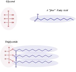 *la condensazione del gruppo carbossilico di tre molecole di acidi grassi con i tre gruppi ossidrili di una molecola di glicerolo, porta alla formazione dei TRIGLICERIDI.