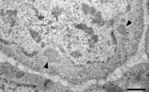 Fig. 1.3: immagine al microscopio elettronico a trasmissione (TEM): le frecce indicano la presenza di corpi cromatoidi all'interno del citoplasma di un neoblasto