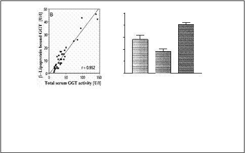 L'associazione dell'enzima GGT con le lipoproteine è stata studiata da Huseby e collaboratori (1982) nel siero di pazienti con patologie epatobiliari. E' stato osservato che il 60-80% dell'attività totale della GGT era legata in complessi con le lipoproteine. Questi ultimi potevano essere separati in due principali frazioni mediante cromatografia per gel filtrazione o elettroforesi in gel di agarosio. Una frazione era caratterizzata da un alto peso molecolare (PM > 600000) e β-mobilità ed era stata ritrovata nel siero di molti pazienti con colestasi. L'altra frazione contenente GGT eluiva in corrispondenza dell'intervallo di PM da 250000 a 450000 e migrava con α1α2-mobilità. Tali PM erano compatibili con complessi tra lipoproteine e questa associazione sembrava essere confermata dalla presenza di attività di GGT nelle frazioni di lipoproteine plasmatiche separate mediante ultracentrifugazione per gradiente di densità. La maggior parte dell'attività della prima frazione (PM > 600000) sembrava associata con le lipoproteine VLDL - LDL, mentre la GGT presente nella seconda frazione (PM: 250000 - 450000) sembrava essere associata con le lipoproteine HDL come osservato nel 70% del siero di pazienti non itterici. Infine entrambe le frazioni erano eterogenee per quanto riguarda le dimensioni, la carica e la densità (Huseby et al., 1982a).