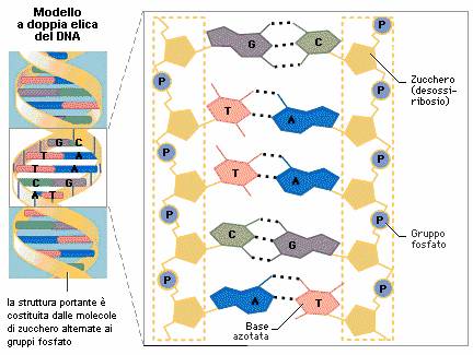 Una molecola di DNA ha la forma di una scala a pioli elicoidale, in cui i montanti sono costituiti da zuccheri e fosfati, e i pioli da coppie di quattro diverse basi azotate: adenina (A), timina (T), citosina (C) e guanina (G). Una determinata sequenza di coppie di basi azotate costituisce un gene; l'informazione in essa contenuta viene interpretata secondo il codice genetico, che stabilisce una corrispondenza tra basi azotate e amminoacidi. In tal modo i geni regolano la sintesi delle proteine.