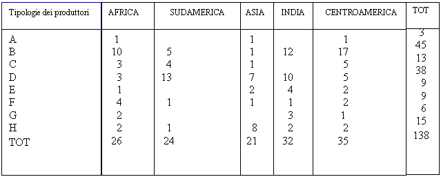 Dalla stessa tabella emerge un dato relativo alla distribuzione geografica dei gruppi di produttori: l'area più rappresentata è data dall'America Latina con 59 gruppi (24 nel Sudamerica e 35 nel Centro America); segue l'Asia con 53 gruppi, di cui 32 nella sola India, quindi l'Africa con 26 gruppi.