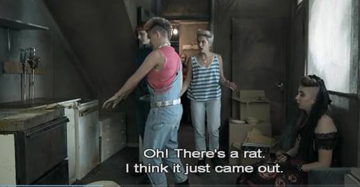 In questa scena di This is England ' 6 (Figura 1 ), il fatto che ci sia un topo in cucina non è chiaramente visibile, ma è esplicitato attraverso le parole di uno dei personaggi.