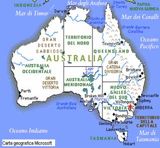 Continente insulare situato tra l'oceano Indiano e l'oceano Pacifico meridionale, a sud-est dell'Asia, che costituisce con la vicina isola della Tasmania lo stato federale del Commonwealth of Australia, membro indipendente del Commonwealth. Il continente è delimitato a nord dal mare di Timor, dal mare degli Arafura e dallo stretto di Torres; a est dal mar dei Coralli e dal mare di Tasman; a sud dallo stretto di Bass e dall'oceano Indiano; a ovest dall'oceano Indiano. La Federazione australiana si estende per circa 4000 km da capo Byron, estremità orientale dell'Australia occidentale, e per circa 3700 km da capo York, a nord, alla Tasmania, a sud. Con una superficie, compresa la Tasmania, di 7.682.300 km2, l'Australia è il più piccolo dei continenti.