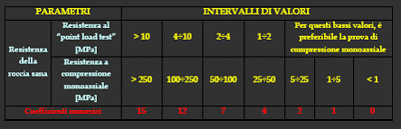 Tabella 3.13. Coefficienti numerici relativi alla resistenza della roccia intatta per la determinazione dell'RMR.