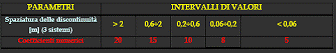 Tabella 3.15. Coefficienti numerici relativi alla spaziatura per la determinazione dell'RMR