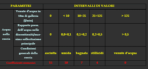 Si può quindi procedere alla classificazione dell'ammasso per la determinazione dell'RMR. Di seguito si riportano le tabelle dei coefficienti numerici utilizzati a tale scopo.