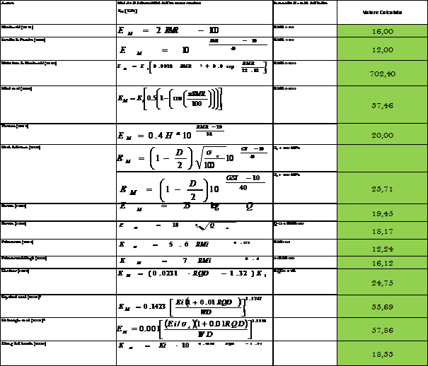 Sulla base delle determinazioni precedenti si sono applicate le formule riportate in Tabella 3.28 per la valutazione del modulo elastico dell'ammasso roccioso.