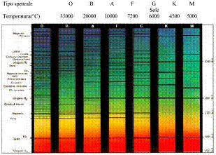 Colori, temperature e spettri stellari. Con l'impiego di spettroscopi, un qualunque raggio luminoso dà origine a uno spettro, cioè a una striscia formata da bande con tutti i colori dell'iride (dal rosso, che corrisponde a luce con lunghezza d'onda maggiore, al blu, con lunghezza d'onda minore), oppure a una serie di righe luminose, la cui posizione e il cui numero dipendono dalla natura chimica della sorgente luminosa. Gli spettri sono una specie di impronte digitali dei vari elementi chimici e costituiscono un potente strumento d'indagine.
