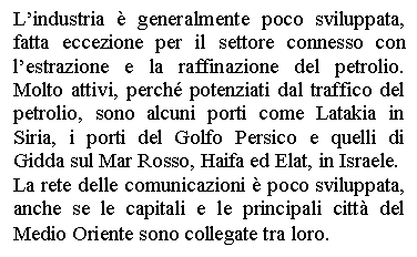 Nel Medio Oriente viene prodotto il 25% del petrolio mondiale, e vi si trova oltre il 60 % delle riserve mondiali di questo prezioso combustibile fossile. I giacimenti principali si concentrano nella fascia occidentale del Golfo Persico: da qui il greggio viene caricato sulle grandi petroliere ormeggiate presso gli attrezzatissimi porti locali, oppure viene pompato nell'oleodotto transarabico (1800 Km), che dalle coste del Golfo Persico giunge fino ai porti del Libano.