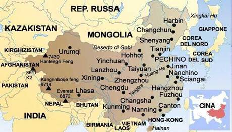 La C. si trova in Asia (lat.53°-18° N; long. 73°-135° E) , confina a N. con la Mongolia e la Russia, a NE con la Corea del Nord , a S con il Viet Nam, il Laos,il Myanmar (Birmania) e India, a SO con il Bhutan, il Nepal e l'India, a O con il Pakistan, l'Afghanistan e il Tagikistan, a NO con il Kirghizistan e il Kazakistan .A E si affaccia al Mar Giallo e al Mar Cinese Or. e a SE al Mar cinese Mer.; fanno parte della Cina le isole Pratas=Dongsha Qundao (1,5 kmq) a SE di Hong Kong, abitate da cinesi.