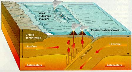 - margini distruttivi o convergenti: le fosse oceaniche, lungo le quali la litosfera, divenuta fredda e densa, viene distrutta tramite un processo di subduzione;